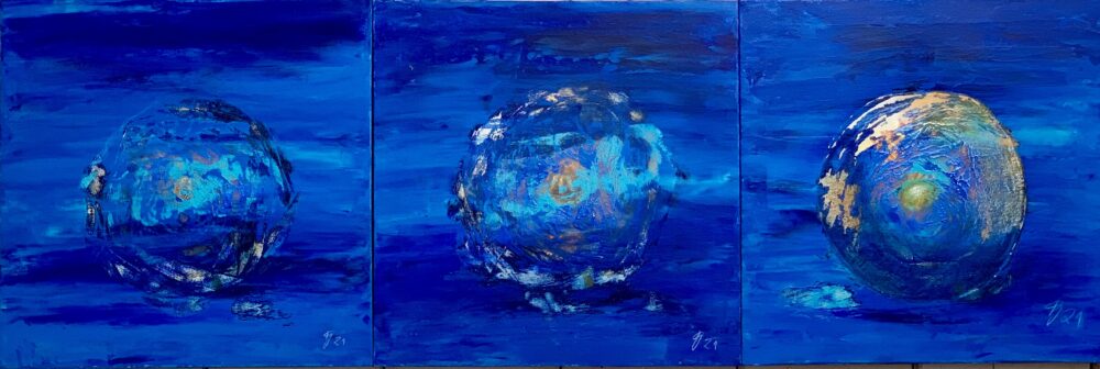 In der isolierten Zeit der Pandemie 2021 entstanden aus tiefen Emotionen – Traurigkeit, Wut, Machtlosigkeit und Angst – drei kleine, lebendige Leinwandbilder. Dieser kreative Ausbruch manifestierte sich zunächst in der Darstellung der Weltenschönheit, gefolgt von zwei weiteren Bildern, die deren schrittweisen Zerfall illustrieren. Diese Werke, geboren aus der Notwendigkeit, inneren Aufruhr in Schönheit umzuwandeln, bieten auch eine Perspektive der Hoffnung: Betrachtet man sie rückwärts, erzählen sie von der Entstehung der Welt. Ein künstlerischer Zyklus, der sowohl Zerstörung als auch Wiedergeburt umfasst, reflektiert meine Reise und meine Antwort auf globale Unsicherheiten.